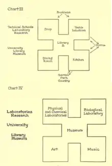 To illustrate this he provides a detailed description of a school building designed around the principle of these relationships. On the first floor the four corners represent practice, the machine shop, the textile industries, the dining room, and the kitchen. These are arrayed around the central library, illustrating always that the meaning of these activities are not the activities themselves, but the "theory of practical activities" which these activities help explicate. These activities are meaningful in the realm of the home and commerce to the individual, but they gain their social meaning from the collective knowledge of the center.