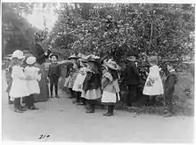 Drawing of Teacher Leading Children in "Finger Plays", one of the methods of imitation and abstraction preferred by Froebel.