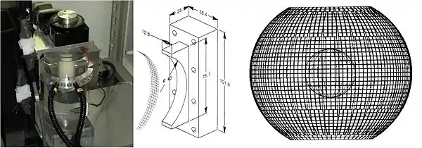 In order to capture sufficient thermoacoustic data to form an accurate 3D map of electromagnetic absorption, it is necessary to surround the anatomy being imaged with a 2D array of transducers. The world's first 3D thermoacoustic animal scanner (Fig. 8: left panel) accomplished this by combining a cylindrical array of 128 transducers (Fig. 8: center panel) with rotation of the animal being imaged about the vertical axis. The net result was to capture thermoacoustic data over the surface of a sphere surrounding the animal being imaged (Fig. 8: right panel).[21] This device was capable of visualizing structures as small as 1/3 millimeter. An animated 3D image of the vasculature in the head of a mouse is displayed in Fig. 9. This animated image was acquired using near infrared radiation at 800 nm, where optical absorption by blood is higher than surrounding tissues. Therefore, the vasculature is preferentially visualized. Microwaves have also been used to form 3D thermoacoustic images of the human breast. One of the first devices to do so is depicted in Fig. 10. It consisted of an array of eight waveguides, which directed microwave energy into the breast. A transducer array was rotated in synchrony with the waveguides in order to acquire sufficient data to reconstruct the internal structures of the breast. Figure 11 shows an animation of the typical glandular tissue pattern in a normal breast.