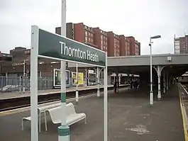 Thornton Heath is a railway station in the London Borough of Croydon in south London, 8 miles 64 chains (14.2 km) down the line from London Victoria.[2] It is on the Brighton Main Line between Norbury and Selhurst. The station is operated by Southern, who also provide all train services.The station is in Travelcard Zone 4.