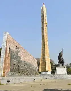 The Tiglachin Monument (Amharic: ትግላችን ሐውልት, lit. 'Our Struggle Monument'), also known as the Derg Monument (Amharic: ደርግ ሐውልት), is a memorial to Ethiopian and Cuban soldiers involved in the Ogaden War. It was built during the rule of Mengistu Haile Mariam and is located on Churchill Avenue in Addis Ababa, Ethiopia. The monument is composed of various elements: a central statue, a 50 m tall pillar, two wall reliefs on the sides and two squares where the portraits of Cuban soldiers are visible.[1] Some sculptures at the monument was given by the North Korean government in 1984, and was one of the project’s first monuments to be donated to Africa.[2]