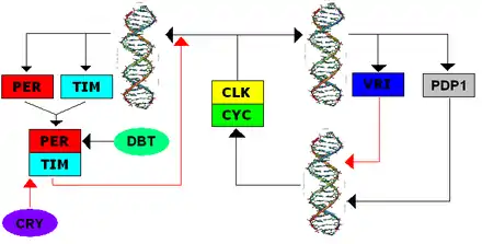 In Drosophila, the negative regulator PER, from the PER/TIM complex, is eventually degraded by a casein kinase-mediated phosphorylation cycle, allowing fluctuations in gene expression according to environmental cues. These proteins mediate the oscillating expression of the transcription factor VRILLE (VRI), which is required for behavioral rhythmicity, per and tim expression, and accumulation of PDF (pigment-dispersing factor).[16]