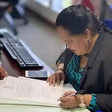 Surrounded by a roomful of World War II survivors,[23] on January 3, 2020, Speaker Muña Barnes's local legislation to pay war claims was signed into law by Governor Lourdes A. Leon Guerrero.[24] Bill 181–35, the Speaker's War Claims Bill was signed into law as Public Law 35–61.[24]