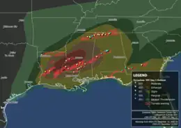 The first signs of organized severe weather came on December 12, when the Storm Prediction Center (SPC) outlined a day 5 risk area across portions of the Mid-South and lower Ohio River Valley.[4] This 15% delineation area was shifted southwestward the following day and translated to a broad Slight risk for severe weather on December 14.[5][6] In their first day 2 outlook, the SPC introduced an Enhanced risk across portions of Louisiana, Mississippi, and Alabama.[7] By the late morning of December 16, a Moderate risk area was introduced from eastern Louisiana through central Mississippi.[8]