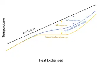 During the heating phase, which is typically considered an isobaric process, the working fluid overcomes the critical temperature, moving thus from the liquid to the supercritical phase without the occurrence of any evaporation process, a significant difference between subcritical and transcritical cycles.[11] Due to this significant difference in the heating phase, the heat injection into the cycle is significantly more efficient from a second law perspective, since the average temperature difference between the hot source and the working fluid is reduced.[12]
