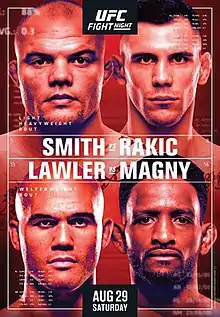 UFC Fight Night: Smith vs. Rakić (also known as UFC Fight Night 175, UFC on ESPN+ 33 and UFC Vegas 8) was a mixed martial arts event produced by the Ultimate Fighting Championship that took place on August 29, 2020, at the UFC Apex facility in Enterprise, Nevada, part of the Las Vegas Metropolitan Area, United States.[2]