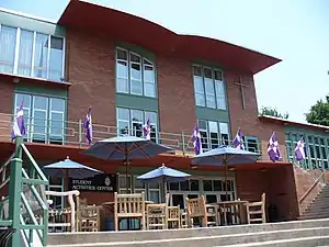 The Loyola Science Center contains 34 teaching and research laboratories, a rooftop greenhouse for teaching and research, a 180-seat lecture hall for symposia and seminars, numerous group study and research areas, 22 classrooms, 80 offices, a multi-story atrium, and a vivarium.[66] Additionally, the second floor of the Harper-McGinnis wing contains an area which highlights student, faculty, and community work and engages visitors.[67] It contains a large television which displays the University Twitter feeds, the science center's energy usage, and videos featuring student and faculty research; glass exhibits which feature research projects and science displays; and aquariums which house fish for student study from a variety of different ecosystems.[67] The Loyola Science Center also contains Bleeker Street, a coffee shop and cafe. The center was designed to meet the Silver standard for Leadership in Energy and Environmental Design (LEED) certification, though it has not gone through the certification process.[68]