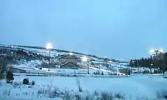 Costing about $25 million to construct, the track uses 297,000 watts of track lighting, 62 water hydrants (for ice- and snowmaking), 24 cameras, eight scoreboards, and 49 timing points.[9] Generally open from October to the end of March annually, the track takes a total of 18 days to ice down to the required thickness needed to run sliding events.[9] The track has 54 miles (87 km) of piping with 110,000 pounds (50,000 kg) of ammonia refrigeration able to keep the track to −14 °F (−26 °C).[9][10] During the operating season, a nine-man crew smooths the track daily.[10] A total of 59 temperature probes are located throughout the track to ensure the ice temperature is properly monitored.[9] Throughout the track, a $1 million retractable shading system protects the course from sun and snow, which reduces energy usage by 25 percent and the need to clear the track from snow.[9]