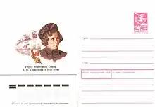 A street and secondary school in Bryansk were named in honor of Safronova. By decree of the Supreme Soviet she was posthumously awarded the title Hero of the Soviet Union in 1965, over twenty years after her death. In 1970 a monument in her likeness was placed in Bryansk, and in 1989 a Soviet envelope featuring her portrait (pictured) was issued.[11]