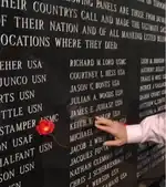 The Veterans Memorial Wall is located at 1145 East Adams Street, adjacent to TIAA Bank Field in downtown Jacksonville, Florida. The quarter-million dollar monument was dedicated in November, 1995 and serves as a tribute to more than 1,500 Jacksonville area American war heroes. The outdoor memorial was promoted as "the largest of its kind" and "the only wall that honors veterans from all six [service] branches" (Army, Navy, Marines, Air Force, Coast Guard and Merchant Marine).[1] The 65-foot (20 m) long black granite monument contains the names of servicemen and women from World War I through Operation Desert Storm and the current war on terrorism. In front of the wall stands a torch with an eternal flame.
