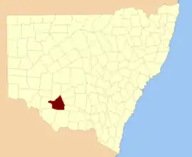 Waradgery County is one of the 141 Cadastral divisions of New South Wales. It contains the town of Hay. It includes the area between the Lachlan River and the Murrumbidgee River where they meet. The Lachlan River is the northern boundary of the county, and the Murrumbidgee for a small section is the southern boundary, but the county also includes some of the land to the south of the Murrumbidgee near Hay.