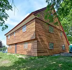 The White–Ellery House is one of just a few hundred First Period (c. 1620–1725) houses in eastern Massachusetts. It is a 2 ½ story "saltbox" structure with a central chimney that once serviced six fireplaces. The building has vertical plank frame construction with an integral lean-to roof. There is a framed overhang on the front façade, and rare examples of raised-field paneled doors between rooms on the first floor. The Renaissance-inspired architectural features illustrate the transition from European building traditions to early American ones. Inside there are several examples of early decorative detail, including three different examples of painted wall decoration, elaborate chamfering (decorative plane work) on ceiling beams, and one of the most highly developed front staircases of the period in eastern Massachusetts.[5][6]