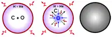 White dwarfs are thought to be the final evolutionary state of stars whose mass is not high enough to become a neutron star or black hole. This includes over 97% of the stars in the Milky Way.[4]: §1 After the hydrogen-fusing period of a main-sequence star of low or medium mass ends, such a star will expand to a red giant during which it fuses helium to carbon and oxygen in its core by the triple-alpha process. If a red giant has insufficient mass to generate the core temperatures required to fuse carbon (around 1 billion K), an inert mass of carbon and oxygen will build up at its center. After such a star sheds its outer layers and forms a planetary nebula, it will leave behind a core, which is the remnant white dwarf.[5] Usually, white dwarfs are composed of carbon and oxygen (CO white dwarf). If the mass of the progenitor is between 8 and 10.5 solar masses (M☉), the core temperature will be sufficient to fuse carbon but not neon, in which case an oxygen–neon–magnesium (ONeMg or ONe) white dwarf may form.[6] Stars of very low mass will be unable to fuse helium; hence, a helium white dwarf[7][8] may form by mass loss in binary systems.