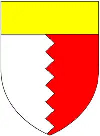 Arms of Willington (ancient): Party per pale indented argent and gules a chief or. All the sons of Ralph de Willington and Joan de Champernon abandoned their paternal arms of Willington (ancient) in favour of a differenced version of their maternal arms of Champernon.[5] These ancient arms are shown in 19th-century stained glass in Atherington Church impaling the arms of Champernowne
