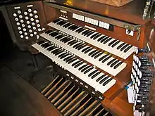 Zion’s first organ, a Bohler, was installed in 1889 at a cost of $2,325. Then in 1928, the Möller organ still serving the congregation today was installed for $10,500. The organ was built at the M.P. Moller Pipe Organ Company in Hagerstown. In 1963 the organ was rebuilt and 1,544 new pipes were added. Previous renovations included preparations in the console for further tonal enhancements. Improvements to the Möller organ are ongoing in an effort to keep the organ state-of-the-art. Zion's organ now has a total of 2,217 pipes, ranging in size from smaller than a pencil to 16 feet (4.9 m) long.[11]