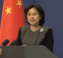 Hua Chunying (Chinese: 华春莹) (born 24 April 1970) is a Chinese official and former diplomat serving as spokesperson for the Ministry of Foreign Affairs of the People's Republic of China since 2012 and as the Assistant Minister of Foreign Affairs since 2021.