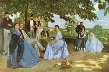 - One of the curious features of Impressionism... was the casualness of their work. ...[T]he painters gave the impression of hastily concocted canvases... more... inspiration than... patient labor. The effortless stroke of genius became a leading measure of artistic quality, partly because it denied mere "work." ..."Art for art's sake" was an invention of the romantic era in France. ...They looked towards a mythical past in which the "natural" person could cultivate self-expression, free of the claims of social utility. This fantasized past... had an anti-industrial character. ...Work was despised because the growing industrial revolution was separating it from inventiveness, originality, and individualism. ...The inventiveness and spontaneity that independent artists sought were... opposed to industrial work,... products (with which they associated academic art) and for many... cities... Women and men held parasols and croquet mallets, not sickles and hoes, and dahlias were more attractive than cabbages. (It is true that Pissarro retained much of the outlook of Barbizon artists...) The work ethic implicit in Barbizon art... was done away with by the impressionists. The suburb and the coastal resort, not the farm, is the landscape of Morisot, Renoir, Manet, and Monet. ...The Impressionists ...joined other middle-class vacationers (except for Cézanne and Pissarro, so little in sympathy with Parisian society).