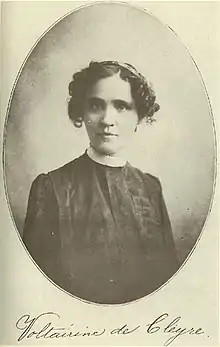 Voltairine de Cleyre (17 November 1866 – 20 June 1912) was an American anarchist and feminist writer and orator, who opposed statist policies, marriage, and the domination of religion in human sexual roles and women's opportunities. A proponent of libertarian socialism and the free thought movement, she was initially drawn to individualist anarchism but evolved into accepting mutualism and stateless communism, while formally labelling herself only an anarchist and shunning doctrinal fractiousness, believing that any system was acceptable as long as it did not involve coercive force.