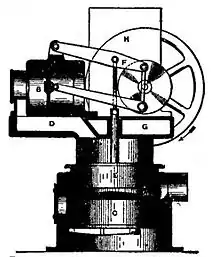 The type survives in some small domestic motors, an example of which, manufactured under the patent of H. Robinson, is shown in fig. 2. In this there is no compressing pump, and the main pressure of the working air is simply that of the atmosphere. The whole range of pressure is so slight that no packing is required. Here A is the vessel in which the air is heated and within which the displacer works. It is heated by a small cokefire or by a gas flame in C. It communicates through a passage (D) with the working cylinder (B). The displacer (E), which takes its motion through a rod (I) from a rocking lever (F) connected by a short link to the crank-pin, is itself the regenerator, its construction being such that the air passes up and down through it as in one of the original Stirling forms. The cooler is a water vessel (G) through which water circulates from a tank (H). Messrs. Hayward and Tyler’s “Rider” engine may be mentioned as another small hot-air motor which follows nearly the Stirling cycle of operations.