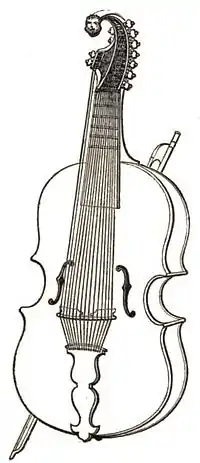 The modern Greek 'lyra' is a kind of rebec, a bowed instrument with three strings, having no connection with the ancient lyre or cithara, the link between the latter and modern stringed instruments being supplied by the Psaltery, in use in the Byzantine epoch, from which was developed the clavecin, and ultimately the pianoforte. But in the 14th century there were several bowed instruments known in Europe as lyres, and also the Hurdy Gurdy, the lyra mendicorum. In Italy, in the last century, there was a bowed lyra bearing a similar relation to the viol that the well-known theorbo did to the lute—namely, that from a second and higher neck, bass strings were hung that were not in contact with the fingerboard. Three varieties have been distinguished—Lyra di braccio, Lyra di gamba, and Archiviole di lyra. It would be for one of these, a favourite instrument with Ferdinand IV. King of Naples, that Haydn wrote twelve pieces. [See vol. i. 709, 720.] The museums, at home or abroad, known to the writer, have no specimens of this bijuga viol; the cut is taken from the Archiviole di lyra in 'Recueil de Planches de l'Encyclopédie,' tome iii. (Paris, 1784). [ A. J. H. ]
