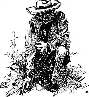 I walked with confidence down the hill toward the professor. So engrossed was he with his employment that he did not see me until I was within a few paces of him. When he looked up at me it was as though his eyes returned from some far journey. I felt at first out of focus, unplaced, and only gradually coming into view. In his hand he held a lump of earth containing a thrifty young plant of the purple cone-flower, having several blossoms. He worked at the lump deftly, delicately, so that the earth, pinched, powdered and shaken out, fell between his fingers, leaving the knotty yellow roots in his hand. I marked how firm, slow, brown, the old man was, how little obtrusive in my field. One foot rested in a furrow, the other was set among the grass of the margin, near the fence—his place, I thought.