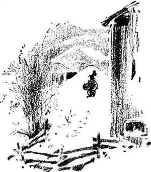 As I worked with my axe and hammer, I heard a light wagon come rattling up the road. Across the valley a man had begun to chop a tree. I could see the axe steel flash brilliantly in the sunshine before I heard the sound of the blow.