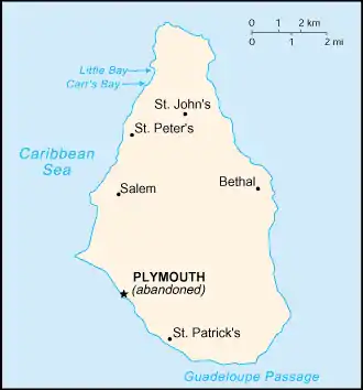 | Capital: | Plymouth (abandoned in 1997 due to volcanic activity; interim government buildings have been built at Brades Estate, in the Carr's Bay/Little Bay vicinity at the northwest end of Montserrat) |