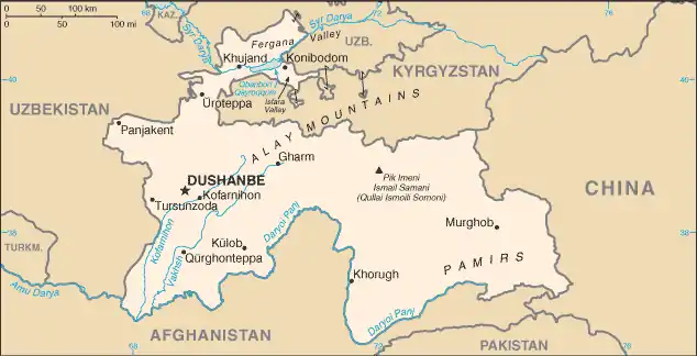 | Terrain: | Pamir and Alay Mountains dominate landscape; western Fergana Valley in north, Kofarnihon and Vakhsh Valleys in southwest |