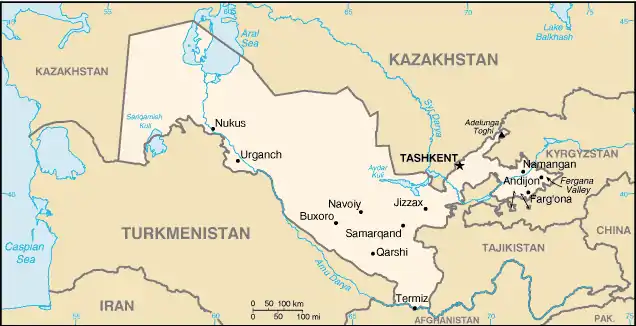 | Administrative divisions: | 12 provinces (viloyatlar, singular - viloyat), 1 autonomous republic* (respublika), and 1 city** (shahar); Andijon Viloyati, Buxoro Viloyati, Farg'ona Viloyati, Jizzax Viloyati, Namangan Viloyati, Navoiy Viloyati, Qashqadaryo Viloyati (Qarshi), Qaraqalpog'iston Respublikasi* (Nukus), Samarqand Viloyati, Sirdaryo Viloyati (Guliston), Surxondaryo Viloyati (Termiz), Toshkent Shahri**, Toshkent Viloyati, Xorazm Viloyati (Urganch) note: administrative divisions have the same names as their administrative centers (exceptions have the administrative center name following in parentheses) |
