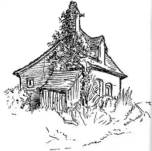 And if the cottage is complicated (that is, filled with detail, the thatch deep and overhanging, the creepers thick and concealing the shape of the wall, and the little lattice-windows nearly hidden from view), draw a portion of the cottage—a corner of the eaves and one window, a portion of the roof and the queer old chimney, the porch with its potted plants and window-seat, or the well-head with its dripping rope and