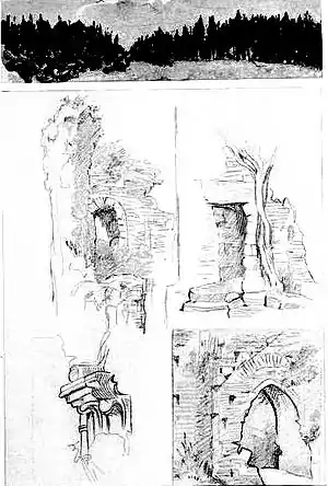 Rough in the whole mass, the general structure. Look for the highest point, compare the position of each thing with that point, then, having settled on the principal forms, look for the darkest dark and brightest light. Try to give an impression of the roughened surface. Draw the near shapes with care. If you sketch the masonry in the foreground with accuracy, then the parts that lie farther away can be more slightly drawn. The little bit of knowledge acquired by sketching something with care has a very solid value. Young sketchers faced with picturesque ruins are often tempted to try a tricky way of drawing.