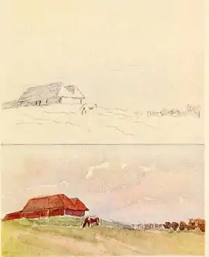 A barn on the top of a sloping field, with a horse cropping the turf, and a morsel of a fence is as simple and direct a subject as one could find. Begin by sketching the slope of the ground, on which erect the shape of the barn, with its pointed roof, then the upright palings and short bushes, the horse with bent neck and the barrel shape of its rounded body.