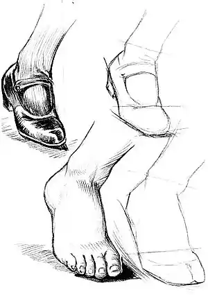 A highly polished leather is easier to draw than a soft dull glacé or suède, for it accentuates light and shade. The bright light on the toe, the half-moon of light on the side of the foot, the dull disc of light that indicates the ankle, are of great value; they show the position of the bones. Keep these bright; do not dim their surfaces.