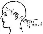 The indenting curve at the base of the skull is not level with the jaw—but see !—it is a little below the level of the ear and on a line with the nostril.