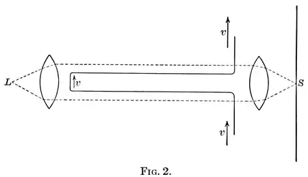 But the theory of Hertz has led to various contradictions with experience. I will refer here to the most important of these. Fizeau brought (1851) into parallelism a bundle of rays originating in a light source by means of a lens and then brought it to a focus by means of a second lens upon a screen (Fig. 2). In the path of the parallel light rays between the two lenses he placed a tube system of such sort that a transparent liquid could be passed through it, and in such manner that in one half (the upper) the light rays would pass in the direction of flow of the liquid while in the other half (the lower), the rays would pass in the opposite direction.