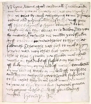 myne awne good cardinall I recomande me vnto yow as hartely as hart can thynke/ so it is that by cause wrytting to me is somwhat tedius and paynefull/ therfor the most part off thes bysynesses I haue comyttyd to our trusty coseler thys berrar to be declaryd to yow by mowthe to whyche we wolde you shulde gyff credens/ nevertheles to thys that folowith I thought not best to make hym pryue nor non other but yow and I whyche is that I wolde you shulde make good wache on the duke off suffolke on the duke off bukyngam on my lord off northe omberla on my lord off darby on my lord off wylshere and on others whyche yow thynke suspecte to see what they do wt thes nwes/ no more to yow at this tyme but sapienti pauca