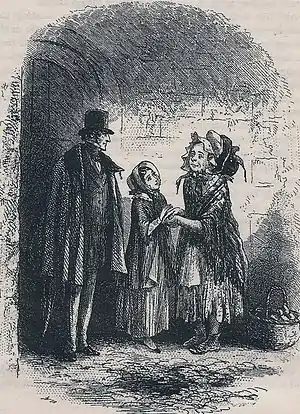 They were come into the High Street, where the prison stood, when a voice cried, ‘Little mother, little mother!’ Little Dorrit stopping and looking back, an excited figure of a strange kind bounced against them (still crying ‘little mother’), fell down, and scattered the contents of a large basket, filled with potatoes, in the mud.