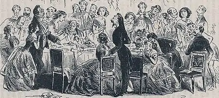 It was principally English; saving that it comprised the usual French Count and the usual Italian Marchese—decorative social milestones, always to be found in certain places, and varying very little in appearance. The table was long, and the dinner was long; and Little Dorrit, overshadowed by a large pair of black whiskers and a large white cravat, lost sight of her father altogether, until a servant put a scrap of paper in her hand, with a whispered request from Mrs Merdle that she would read it directly. Mrs Merdle had written on it in pencil, ‘Pray come and speak to Mr Dorrit, I doubt if he is well.’