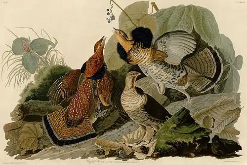 The Ruffed Grouse, although a constant resident in the districts which it frequents, performs partial sorties at the approach of autumn. These are not equal in extent to the peregrinations of the Wild Turkey, our little Partridge, or the Pinnated Grouse, but are sufficiently so to become observable during the seasons when certain portions of the mountainous districts which they inhabit become less abundantly supplied with food than others. These partial movings might not be noticed, were not the birds obliged to fly across rivers of great breadth, as whilst in the mountain lands their groups are as numerous as those which attempt these migrations; but on the north-west banks of the Ohio and Susquehanna rivers, no one who pays the least attention to the manners and habits of our birds, can fail to observe them. The Grouse approach the banks of the Ohio in parties of eight or ten, now and then of twelve or fifteen, and, on arriving there, linger in the woods close by for a week or a fortnight, as if fearful of encountering the danger to be incurred in crossing the stream. This usually happens in the beginning of October, when these birds are in the very best order for the table, and at this period great numbers of them are killed. If started from the ground, with or without the assistance of a dog, they immediately alight on the nearest trees, and are easily shot. At length, however, they resolve upon crossing the river; and this they accomplish with so much ease, that I never saw any of them drop into the water. Not more than two or three days elapse after they have reached the opposite shore, when they at once proceed to the interior of the forests, in search of places congenial to the general character of their habits. They now resume their ordinary manner of living, which they continue until the approach of spring, when the males, as if leading the way, proceed singly towards the country from which they had retreated. The females follow in small parties of three or four. In the month of October 1820, I observed a larger number of Ruffed Grouse migrating thus from the States of Ohio, Illinois and Indiana into Kentucky, than I had ever before remarked. During the short period of their lingering along the north-west shore of the Ohio that season, a great number of them was killed, and they were sold in the Cincinnati market for so small a sum as 12½ cents each.