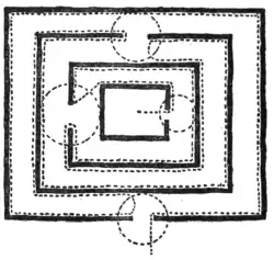 We will now pass to the interesting subject of how to thread any maze. While being necessarily brief, I will try to make the matter clear to readers who have no knowledge of mathematics. And first of all we will assume that we are trying to enter a maze (that is, get to the "centre") of which we have no plan and about which we know nothing. The first rule is this: If a maze has no parts of its hedges detached from the rest, then if we always keep in touch with the hedge with the right hand (or always touch it with the left), going down to the stop in every blind alley and coming back on the other side, we shall pass through every part of