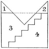 So far, so good. Now, we are directed to apply the old step principle, as shown, and, by moving down the piece 4 one step, form the required square. But, unfortunately, it does not produce a square: only an oblong. Call the three long sides of the mitre 84 in. each. Then, before cutting the steps, our rectangle in three pieces will be 84 × 63. The steps must be 10½ in. in height and 12 in. in breadth. Therefore, by moving down a step we reduce by 12 in. the side 84 in. and increase by 10½ in. the side 63 in. Hence our final rectangle must be 72 in. × 73½ in., which certainly is not a square! The fact is, the step principle can only be applied to rectangles with sides of particular relative lengths. For example, if the shorter side in this case were 6157 (instead of 63), then the step method would apply. For the steps would then be 10½ in. in height and 12 in. in breadth. Note that 6157 × 84 = the square of 72. At present no solution has been found in four pieces, and I do not believe one possible.