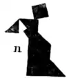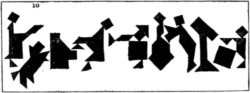By using several sets of Tangrams at the same time we may construct more ambitious pictures. I was advised by a friend not to send my picture, "A Game of Billiards" (9), to the Academy. He assured me that it would not be accepted because the "judges are so hide-bound by convention." Perhaps he was right, and it will be more appreciated by Post-impressionists and Cubists. The players are considering a very delicate stroke at the top of the table. Of course, the two men, the table, and the clock are formed from four sets of Tangrams.