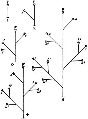 Fig. 14.—Diagrams of the monopodial method of budding, shown in five stages (1-5). F, the founder-polyp; 1, 2, 3, 4, the succession of polyps budded from the founder-polyp; a′, b′, c′, the succession of polyps budded from 1; a², b², polyps budded from 2; a³, polyp budded from 3. |
