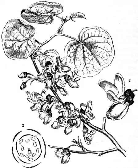 | Fig. 5.—Flowering branch of Judas-tree (Cercis siliquastrum) reduced. 1, Flower, natural size. 2, Floral diagram. |