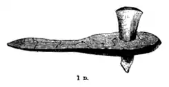 The celt of the simple form was probably (Fig. 1 c) inserted into a wooden haft, as in the example given of the stone implement (No. 1 d).