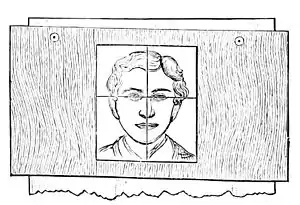 Two small holes are drilled in the plate, one on either side of the aperture. The slip of brass is laid on the portrait with the aperture over its face. It is turned about until one of the cross-threads cuts the pupils of both the eyes, and it is further adjusted until the other thread divides the interval between the pupils in two equal parts. Then it is held firmly, and a prick is made through each of the holes. The portraits being thus arranged, a photographic camera is directed upon