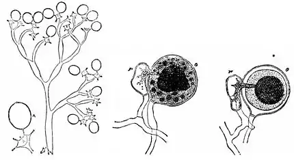 | Fig. 2.—Branch of Lettuce-Mildew. | Fig. 3.—Formation of Grape-Mildew, Winter Spore. |