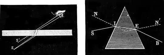 If, now, we take a piece of glass, of a wedge-shape, in which the sides are not parallel, a different effect is produced by the passage of the light through it. Such a piece of glass, or any transparent substance bounded by surfaces in this way, is called a prism. In Fig. 9, the ray S is represented as striking the prism at I, and, as it enters the glass, it is refracted toward the thicker part, and emerges at E. As it passes out into the air it is again bent in the same direction toward the base of the prism. The dotted lines, N I and E N' are drawn perpendicular to the faces of the prism, or at right angles, and serve to show that the path of the ray through the prism also makes equal angles with its surfaces.