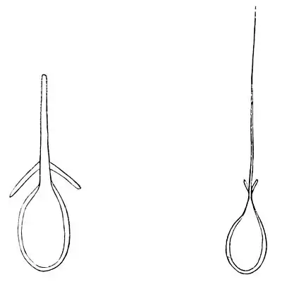 | Fig. 40—Thread-Cell, with its Thread uncoiled. | Fig. 41.—Thread-Cell, with the Spring turned out like a harpoon. |