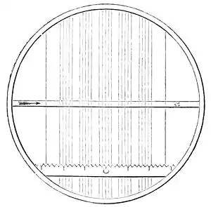 If it were possible for an astronomer to note the exact instant of the transit of a star over a thread, it is plain that one thread would be sufficient; but, as all estimations of this time are, from the very nature of the case, but approximations, several threads are inserted in order that the accidental errors of estimations may be eliminated, as far as possible. The method of making these estimations will be better understood from the two following figures, 1 and 2. Fig. 1 represents
